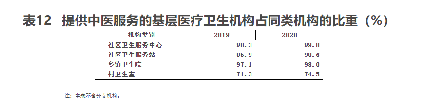 2020年末,提供中医服务的社区卫生服务中心占同类机构的99.0%,社区卫生服务站占90.6%,乡镇卫生院占98.0%,村卫生室占74.5%(见表12)。