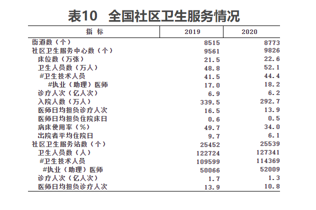 (二)社区卫生。2020年底,全国已设立社区卫生服务中心(站)35365个,其中:社区卫生服务中心9826个,社区卫生服务站25539个。与上年相比,社区卫生服务中心增加265个,社区卫生服务站增加87个。社区卫生服务中心人员52.1万人,平均每个中心53人;社区卫生服务站人员12.7万人,平均每站5人。社区卫生服务中心(站)人员数比上年增加3.8万人,增长6.1%。