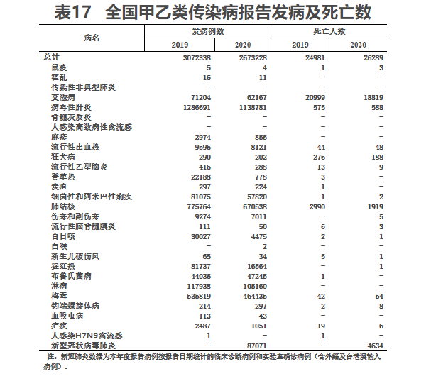 (一)传染病报告发病和死亡。2020年1月20日,国家卫生健康委发布公告,将新型冠状病毒肺炎纳入乙类传染病并按照甲类传染病管理,我国传染病病种增加至40种。2020年,全国甲、乙类传染病报告发病267万例,报告死亡2.6万人。报告发病数居前5位的是病毒性肝炎、肺结核、梅毒、淋病和新型冠状病毒肺炎,占甲乙类传染病报告发病总数的92.2%。报告死亡数居前五位的是艾滋病、新型冠状病毒肺炎、肺结核、病毒性肝炎、狂犬病,占甲乙类传染病报告死亡总数的99.5%(见表17)。