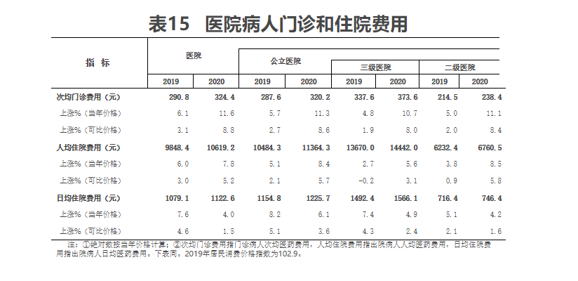 (一)医院病人医药费用。2020年,医院次均门诊费用324.4元,按当年价格比上年上涨11.6%,按可比价格上涨8.8%;人均住院费用10619.2元,按当年价格比上年上涨7.8%,按可比价格上涨5.2%。日均住院费用1122.6元(见表15)。