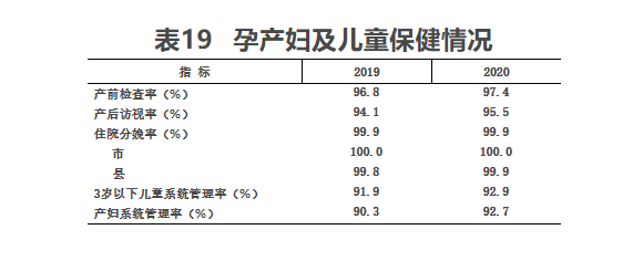 (一)妇幼保健。2020年,孕产妇产前检查率97.4%,产后访视率95.5%。与上年比较,产前检查率和产后访视率均有提高(见表19)。2020年住院分娩率为99.9%(市100.0%,县99.9%),与上年持平。