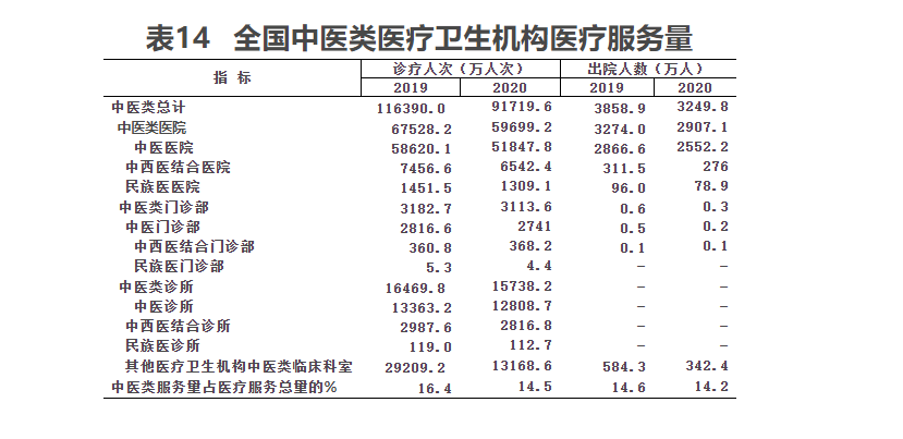 2020年,全国中医类医疗卫生机构出院人数3249.8万人,比上年减少609.2万人(下降15.8%)。其中:中医类医院2907.1万人(占89.5%),中医类门诊部0.3万人,其他医疗卫生机构中医类临床科室342.4万人(占10.5%)(见表14)。