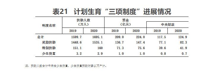 2020年出生人口1200万人。二孩及以上孩次占比为57.1%,出生人口性别比为110.46。2020年计划生育家庭奖励和扶助“三项制度”共投入资金224亿元,比上年增加15亿元;农村部分计划生育家庭奖励扶助制度受益1535.1万人;计划生育家庭特别扶助制度受益160万人,西部地区“少生快富”工程受益2.9万户。