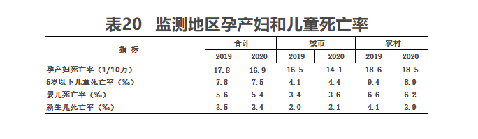 (三)孕产妇死亡率。据全国妇幼健康监测,2020年,全国孕产妇死亡率为16.9/10万,其中:城市14.1/10万,农村18.5/10万。与上年相比,全国孕产妇死亡率有所下降(见表20)。
