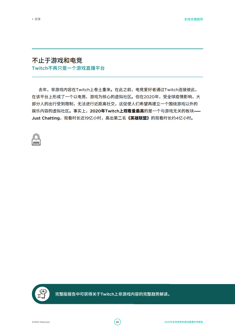 全球电竞及游戏直播市场趋势,新冠疫情影响,中国游戏直播市场,电竞俱乐部的多元化趋势,Twitch超越游戏内容的未来发展,及更多特别专题!