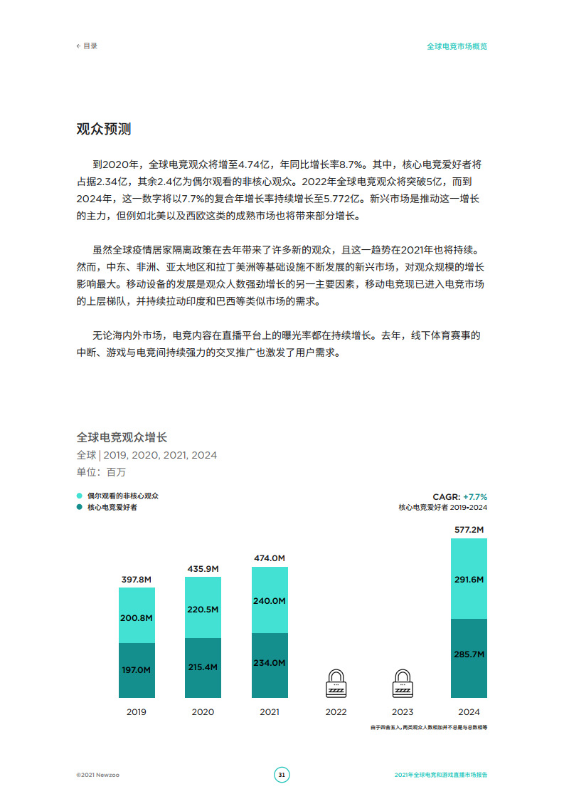 在2021年,全球电竞市场收入将从2020年的9.47亿美元增至10.84亿美元,年同比增长14.5%。报告中还有电竞观众规模数据。