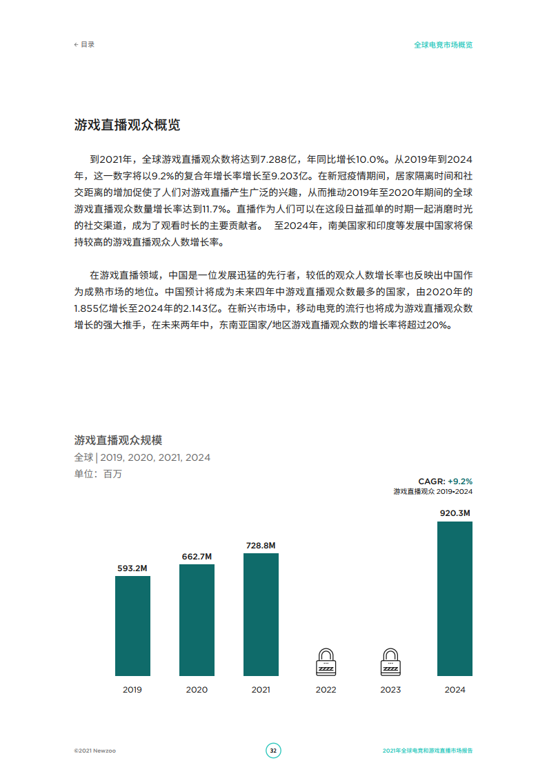 全球游戏直播观众数将在2021年达到7.288亿,同比增长10.0%。本报告将涵盖对电竞和直播市场的预测数据。