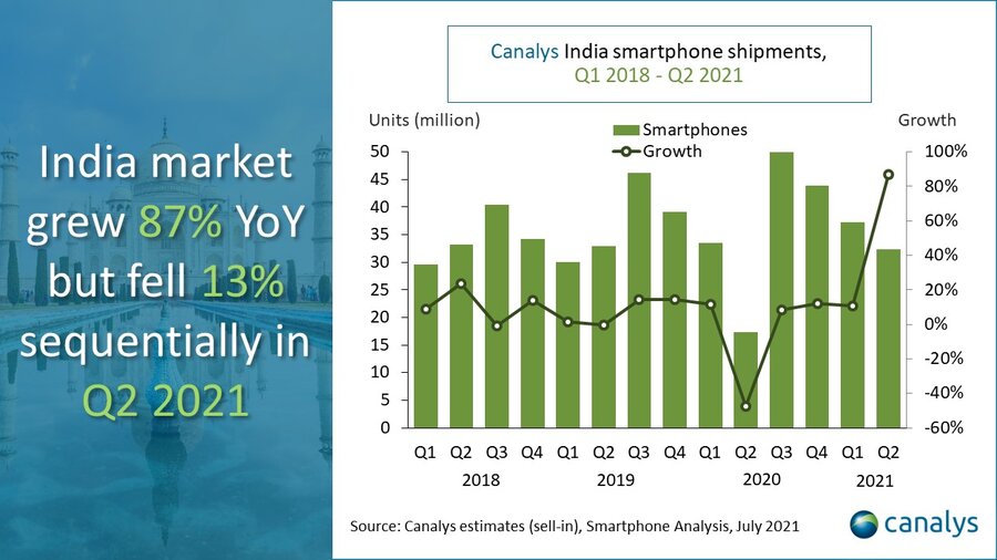与去年同期相比,印度二季度智能手机出货量增长了87%,因去年二季度大部分时间印度在实施严格的全国性封锁。
