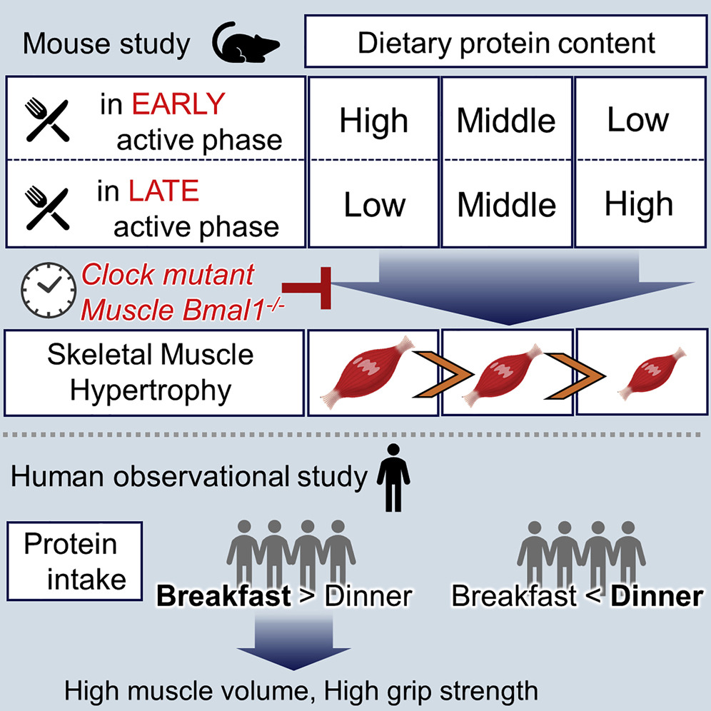 用缺乏调节昼夜节律的基因的小鼠进行的进一步实验发现,早餐和晚餐之间的骨骼肌肉生长没有差异。这肯定了生物体的生物钟似乎对蛋白质代谢的影响。研究的最后部分招募了60名从饮食调查中选出的受试者。半数受试者习惯性地在晚餐时摄入大部分的日常蛋白质,而另一半人则在早餐时摄入更多的蛋白质。