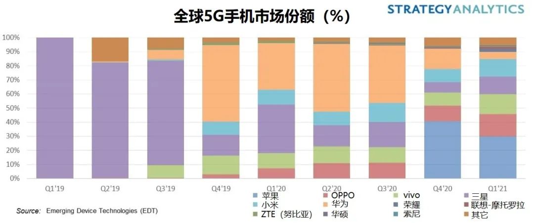 报告显示,2021年Q1,5G收益年增长超过500%。苹果在5G出货量和收益方面领先,同时还在4G LTE收益方面领先。