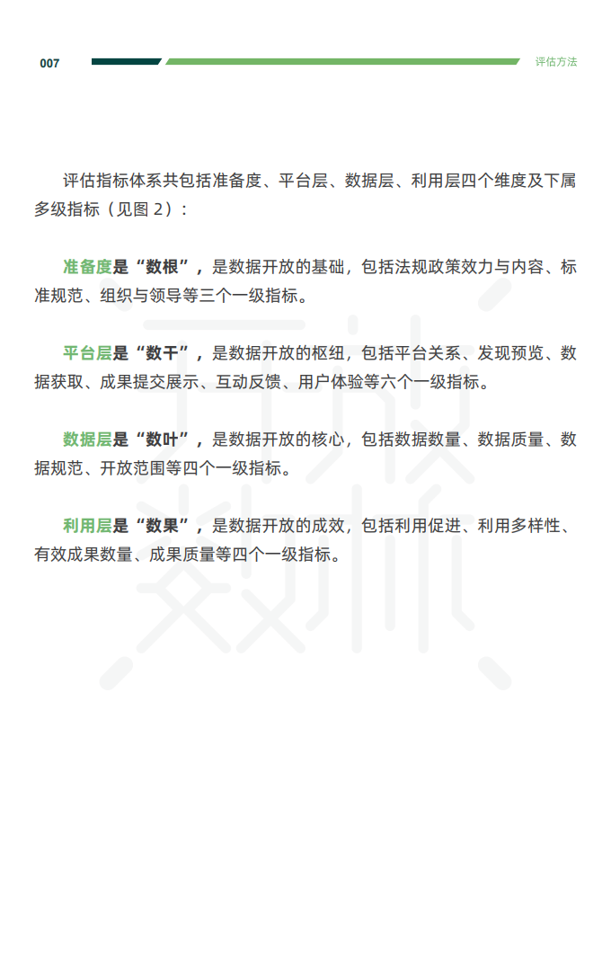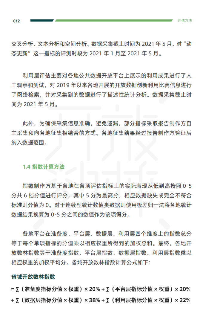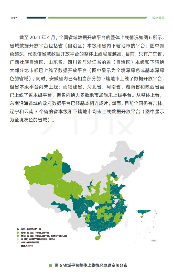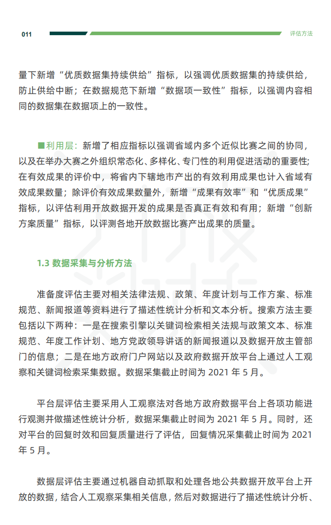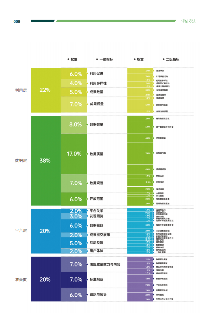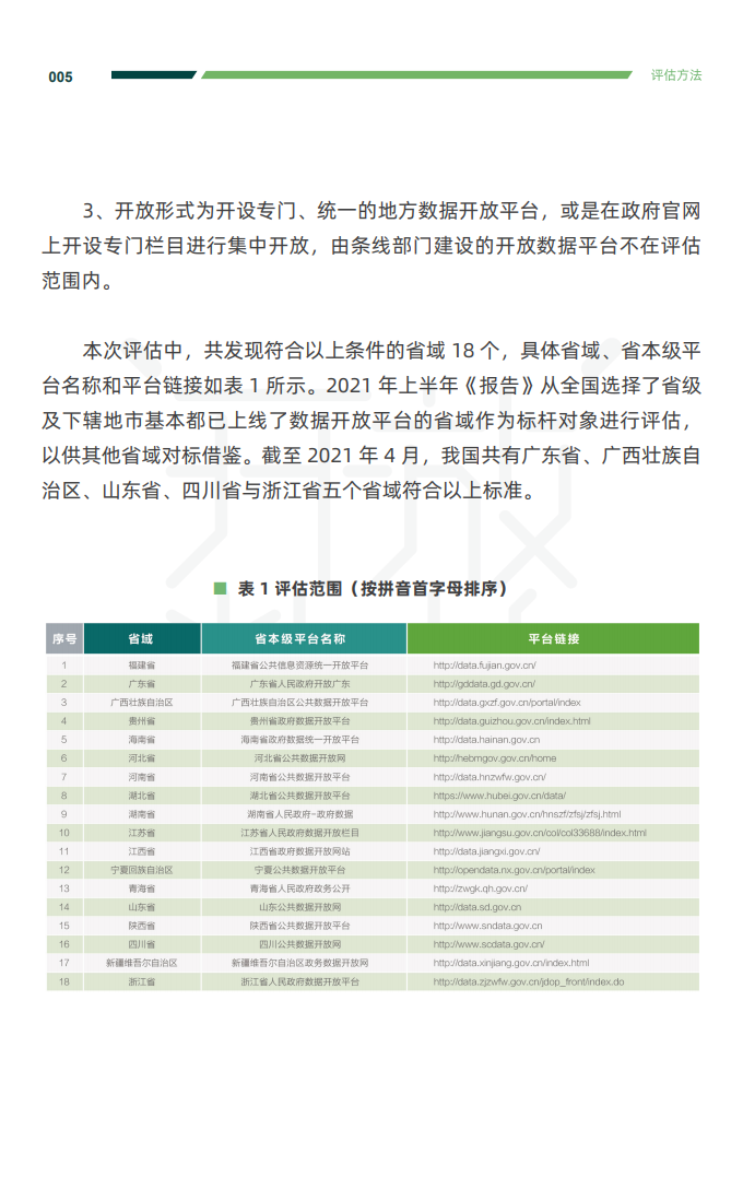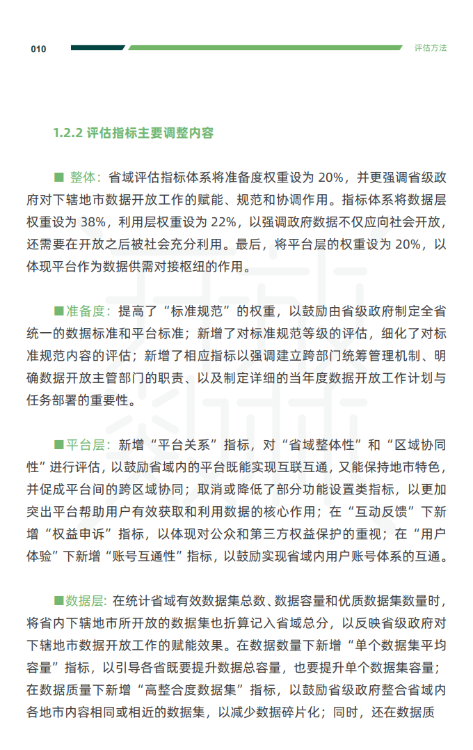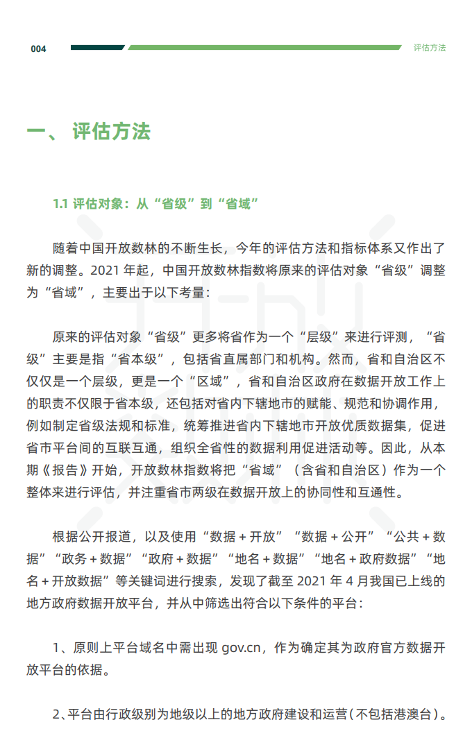 随着中国开放数林的不断生长,2021年的评估方法和指标体系又作出了新的调整,首次将 “省域”作为一个整体性的“区域”,而不仅仅是一个“层级”来进行评测,并注重省市两级在数据开放上的协同性和互通性。这是由于省和自治区政府在数据开放工作上的职责不仅限于省本级的直属部门和机构,还包括对省内下辖地市的赋能、规范和协调作用,例如制定省级法规和标准,统筹推进省内下辖地市开放优质数据集,促进省市平台间的互联互通,组织全省性的数据利用促进活动等。