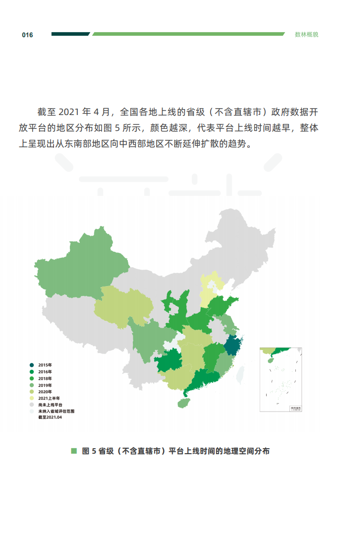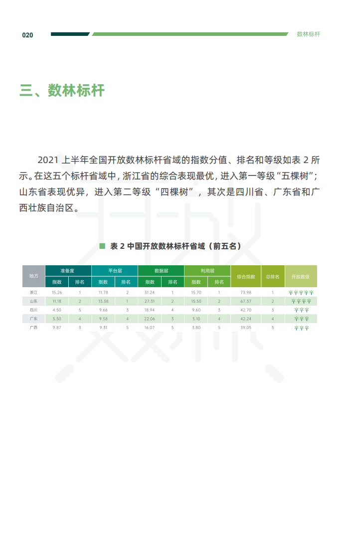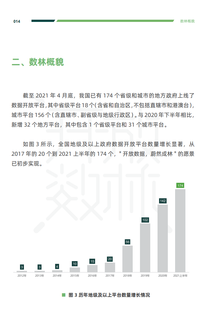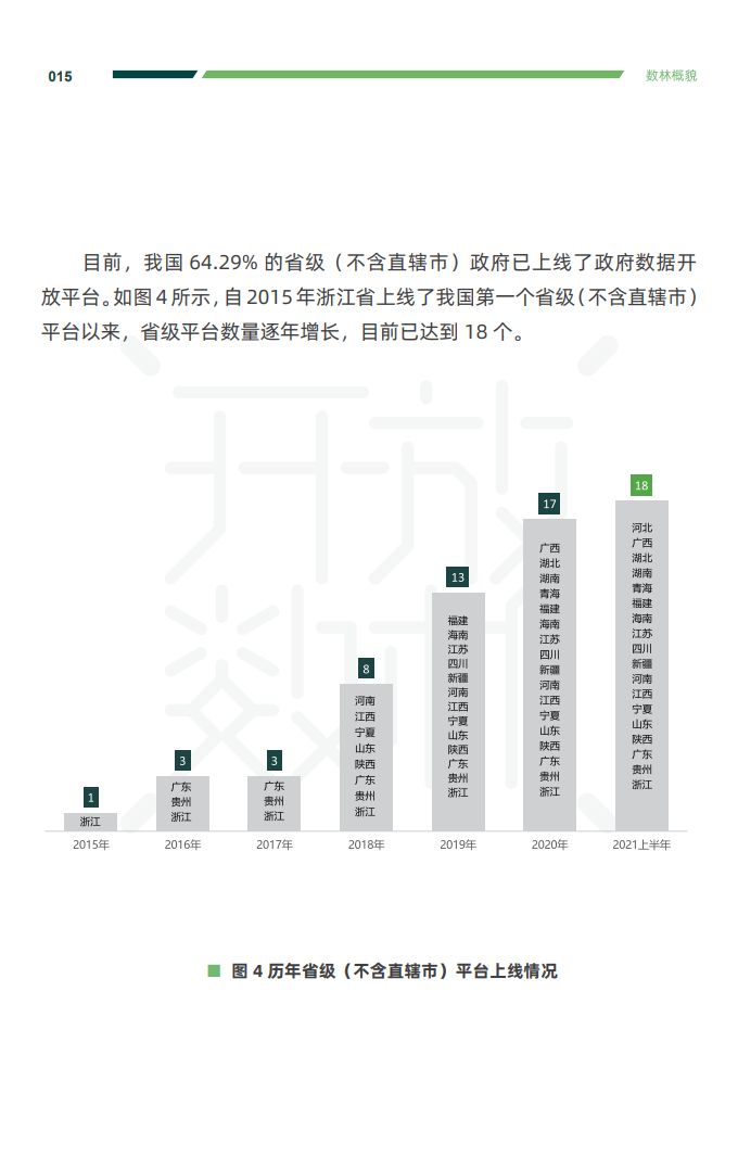 “开放数林”意喻我国政府数据开放利用的生态体系,“中国开放数林指数”精心测量各地“开放数木”的繁茂程度和果实价值,助推我国政府数据开放生态体系的培育与发展,至今已连续第五年发布。2018年以来,“中国开放数林指数”为国家互联网信息办公室信息化发展局跟踪监测我国公共信息资源开放情况提供数据支撑。
