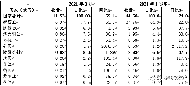 其中,从新西兰进口1.19万吨,占58.6%,同比增加99%,从澳大利亚进口0.36万吨,占17.5%,同比增加71.2%,从欧盟进口0.34万吨,占16.9%,同比增加31.8%。