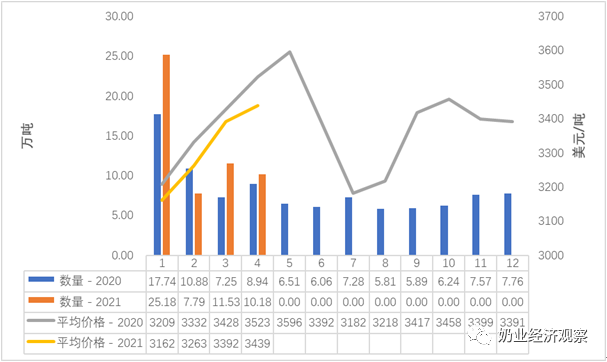 据中国海关统计,2021 年 1-4 月中国共进口稀奶油 9.1 万吨,同比增加 76%,进口额 3.08 亿美元,同比增长 86.8%,平均价格为 3388 美元 / 吨,同比上涨 6.1%。