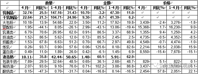 3.1.3 稀奶油 1-4 月进口 + 76% 至 9.1 万吨,价格 + 6.1%