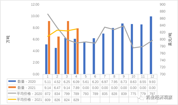 4 月中国共进口包装牛奶 7.89 万吨,同比增加 29.5%,进口额 0.65 亿美元,同比增长 36.1%,平均价格为 829 美元 / 吨,同比上涨 5.1%。