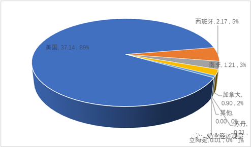 其中,来自美国 37.14 万吨,占比 89.0%,同比增长 14.3%;西班牙 2.17 万吨,占比 5.2%,同比下降 21.2%;南非 1.21 万吨,占比 2.9%,同比下降 12.6%;此外,从加拿大、苏丹、立陶宛等国家也有少量进口。