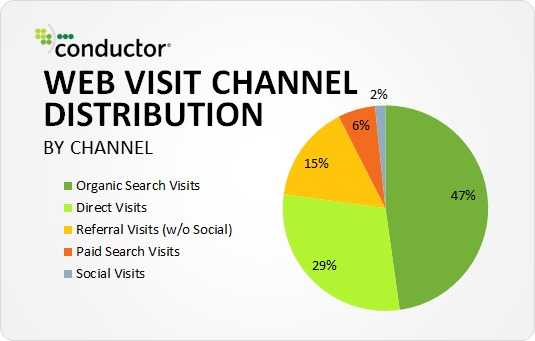 为了了解网站流量的行业来源分布,conductor历时一年分析了6个行业30家网站3.1亿次的访问数据。分析这些数据发现自然搜索占近一半的站内流量来源(47%),社交流量则仅占2%,其他引荐流量来源占15%。
