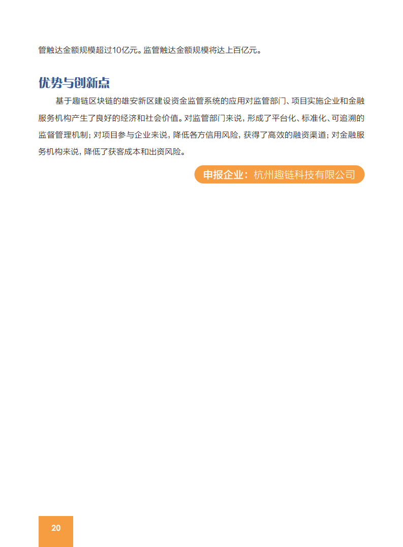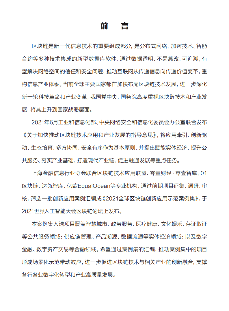 日前,上海金融信息行业协会在上海市经济和信息化委员会指导下,联合区块链技术应用联盟、零壹财经·零壹智库、01区块链、达瓴智库和亿欧EqualOcean等机构公开征集了一批国内外优秀区块链创新应用案例,并从中择优、收录到上海金融信息行业协会主编的《2021全球区块链创新应用示范案例集》。