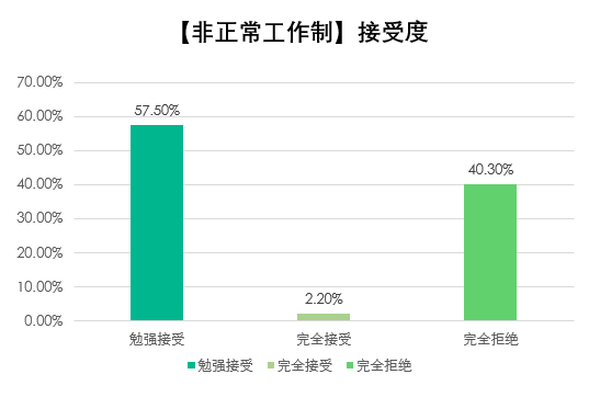 从职位上来看,6.3%的职能人员、4.6%的销售商务人员以及2.3%的技术人员能完全接受“非正常工作制”,位列前三。而总被要求蹭热点跟热度,随时随地上岗的运营,则有45%的浑身写满“拒绝”。