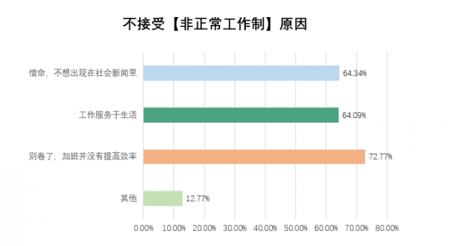 问卷结果显示,在“勉强接受”及“完全接受”非正常工作制的互联网从业者中,47.9%的人认为自己“没得选”,34.8%的人则是为了获得更高的薪资回报。