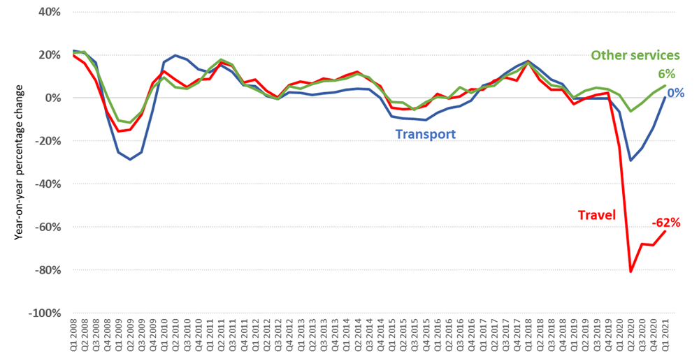 2021年第一季度,全球服务贸易仍然低迷,在旅游服务贸易持续疲软的影响下,全球服务贸易于去年全年出现21%的跌幅后,今年一季度又同比下降了9%(下图蓝线所示)。COVID-19新型变异病毒进一步推迟了国际旅游业的复苏;然而,其他服务行业,如运输业,开始出现反弹。由于疫苗的分布不均和疫情限制的回撤不同,各地区之间存在差异。