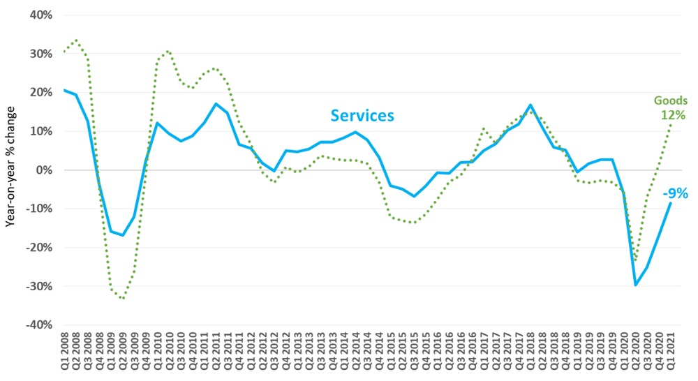 服务贸易的最新数据与全球货物贸易的复苏形成对比,后者在2020年下降9%后,2021年第一季度同比增长12%(上图绿线所示)。