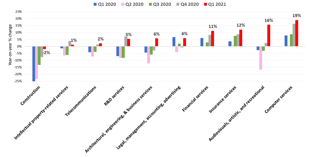 其他服务行业——如建筑、娱乐、法律和金融服务——在今年第一季度平均同比增长了6%。虽然建筑业复苏滞后(全球出口下降了2%),但大多数其他服务子行业都恢复了增长,特别是视听、艺术和娱乐服务(这是受COVID-19相关限制影响最大的行业之一)。计算机服务继续其令人印象深刻的增长,同比增长19%。
