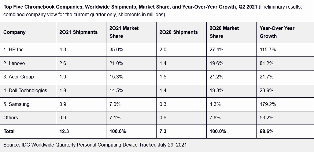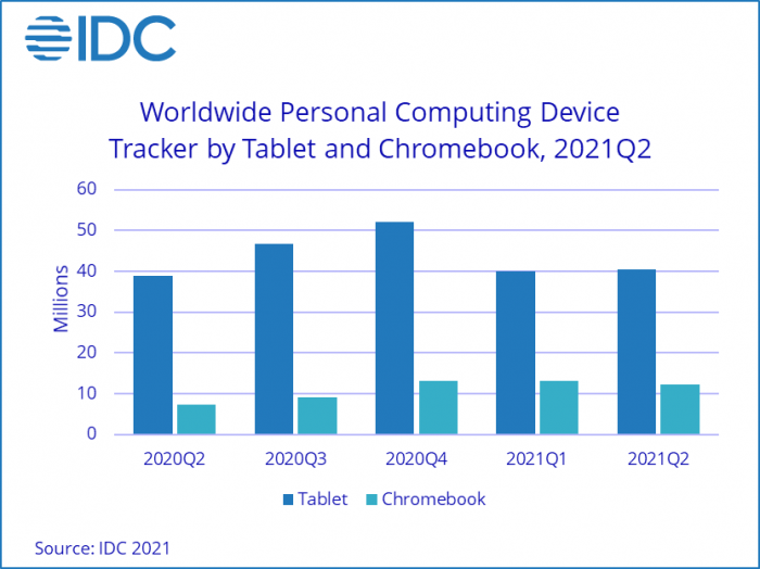 2021年第二季度(2Q21)对Chromebook和平板电脑来说是另一个强劲的季度,尽管同比数据没有那么亮眼,但两个设备类别都继续录得增长,代表这场COVID-19大流行引发的对计算机设备的需求潮依然没有停止的迹象。根据国际数据公司(IDC)全球个人计算设备季度跟踪的初步数据,Chromebook的出货量同比增长68.6%,数量达到1230万台。