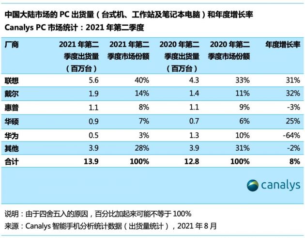 Canalys最新报告显示,2021 年第二季度中国大陆市场的PC 总出货量同比下降 3%,但环比增长 13%,达到 1940 万台。
