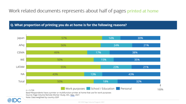 根据IDC对4700人的2021年终端用户调查,在家里打印的纸张中约有50%是与工作有关的文件。以西欧为例,约15%的纸张是为学校/教育需要而打印的,其余的是个人用品。