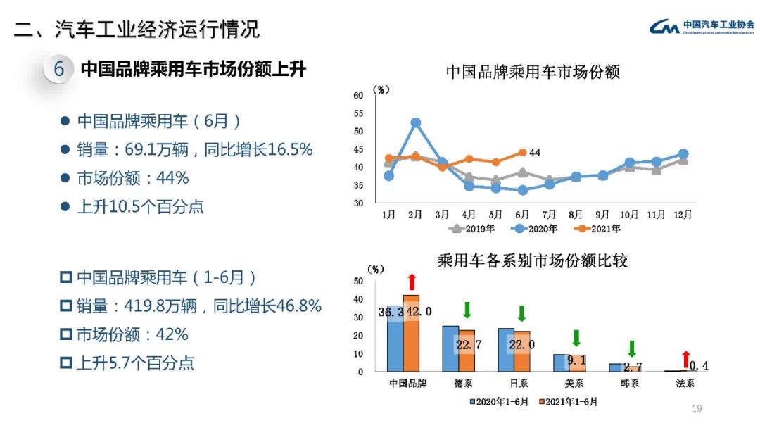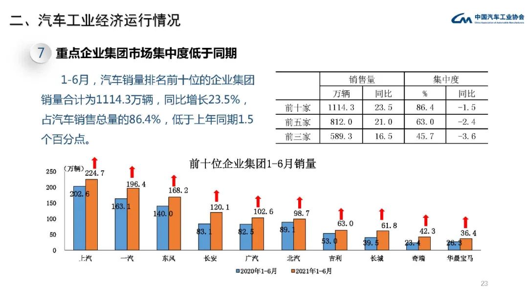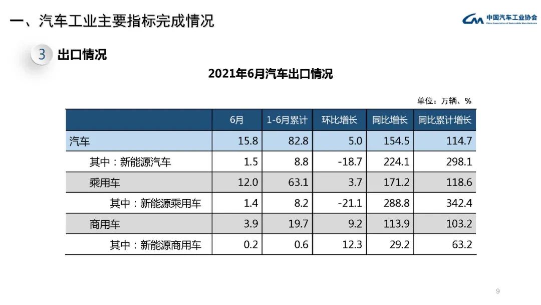 中汽协:2021年6月汽车工业经济运行情况 从本月市场情况来看,汽车产销同比下降,商用车降幅大于乘用车,但新能源汽车与出口依然表现强劲,销量双双刷新历史记录。从上半年市场情况来看,乘用车在芯片短缺、原材料价格上涨等不利因素影响下,销量依然超过1000万辆;新能源汽车累计销量已与2019年全年水平持平,其中纯电动汽车超过100万辆。 更多阅读:中汽协:2021年7月汽车工业经济运行情况中汽协:2018年5月汽车工业经济运行情况中国汽车工业协会:2020年11月汽车工业经济运行情况中汽协:2020年1-2月销量223.8万辆 下降42.0%中国汽车工业协会:2022年11月汽车工业经济运行情况工信部:2023年5月汽车工业经济运行情况中汽协:2022年1月汽车工业经济运行情况中汽协:2024年5月汽车工业产销情况工信部:2016年11月汽车工业经济运行情况中汽协:2022年4月汽车工业产销情况简述中汽协:2023年10月中国汽车工业运行情况中汽协:2022年1月汽车工业产销情况简述中国汽车工业协会:2021年10月汽车工业经济运行情况中国汽车工业协会:2022年4月汽车工业经济运行情况中国汽车工业协会:2022年3月汽车工业经济运行情况