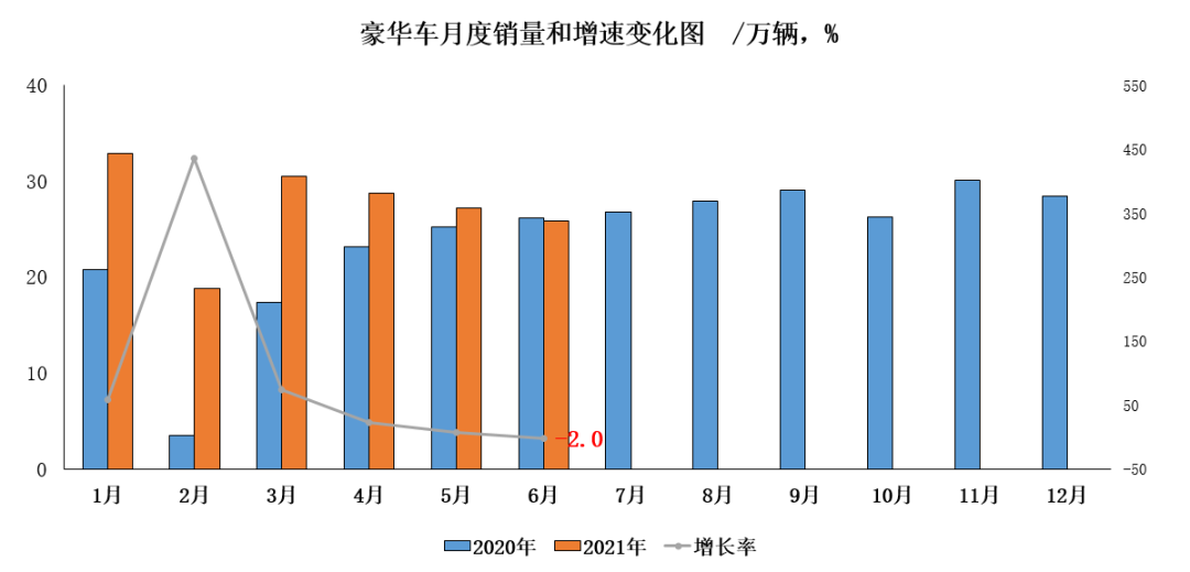 2021年6月,国内生产的豪华车销量同比下降2.0%。