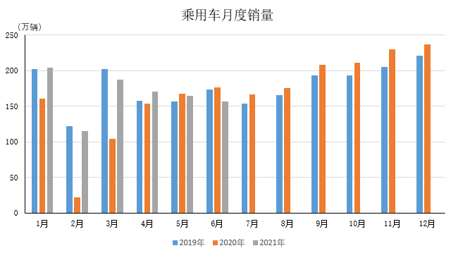 2021年6月,乘用车产销分别完成155.5万辆和156.9万辆,环比分别下降3.8%和4.7%,同比分别下降13.7%和11.1%,与2019年相比,乘用车产销同比下降3%和9.4%,产销增速较5月均由正转负。