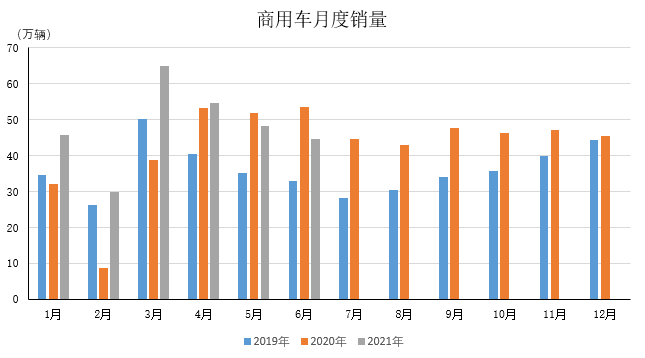 2021年6月,商用车产销38.8万辆和44.6万辆,环比下降8.3%和7.4%,同比下降26.3%和16.8%。