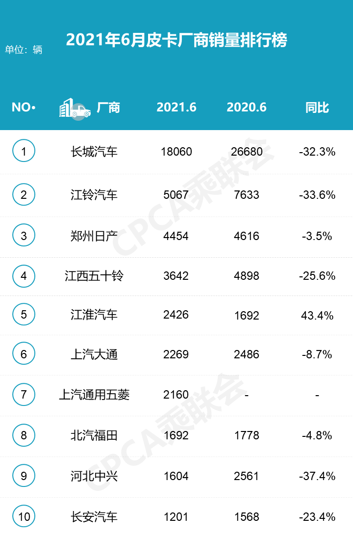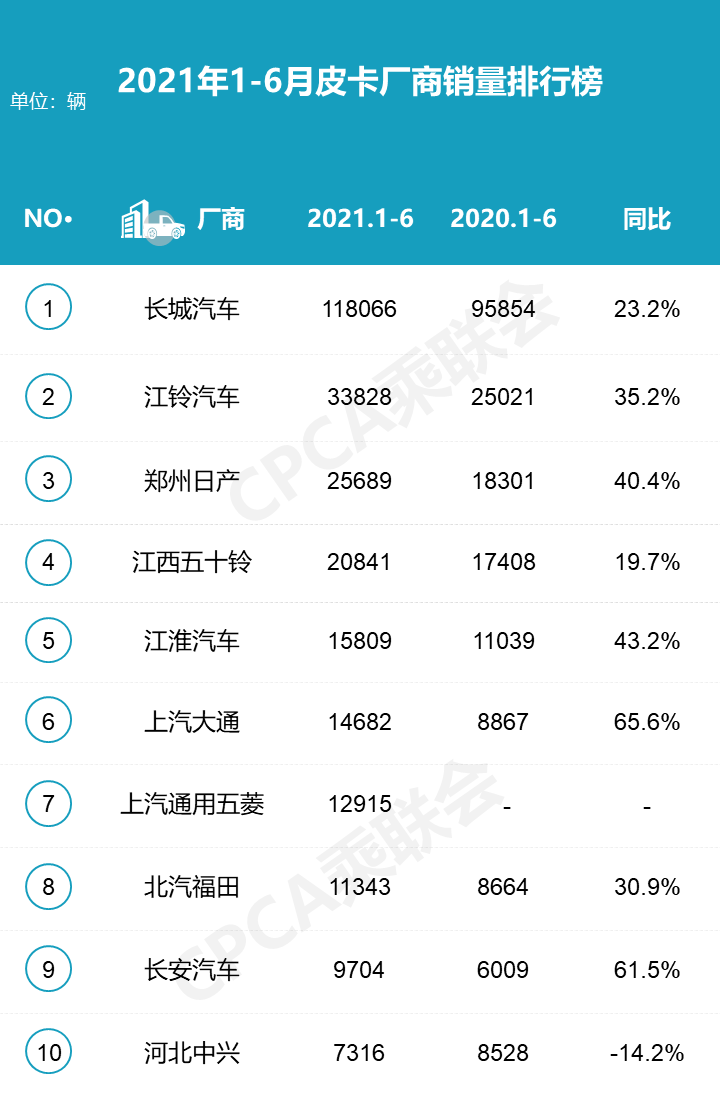 今年1-6月增长34%也是强于总体乘用车和卡车市场的较好表现。近几年皮卡成为乘商结合的消费新热点,持续表现较强,但近期皮卡车企分化,龙头主力车企强势提升,新进入车企强势低价布局并占据二线主力销量地位,部分传统皮卡企业面临巨大的增长压力。