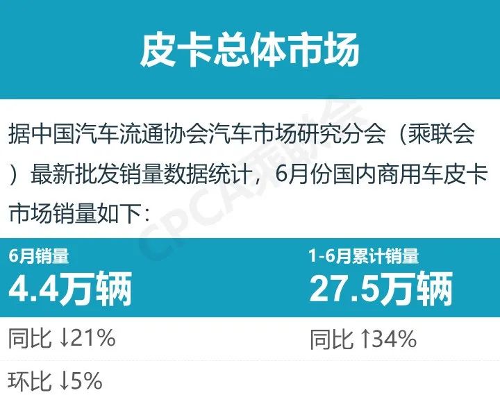 随着皮卡文化的逐步成长,乘用化皮卡新增长点仍保持强势,长城炮6月仍保持万辆以上销量,而江铃皮卡、五十铃皮卡和郑州日产皮卡的商用市场表现较强,加之征途等新品增量,皮卡产品呈现超强于商用车的良好表现。