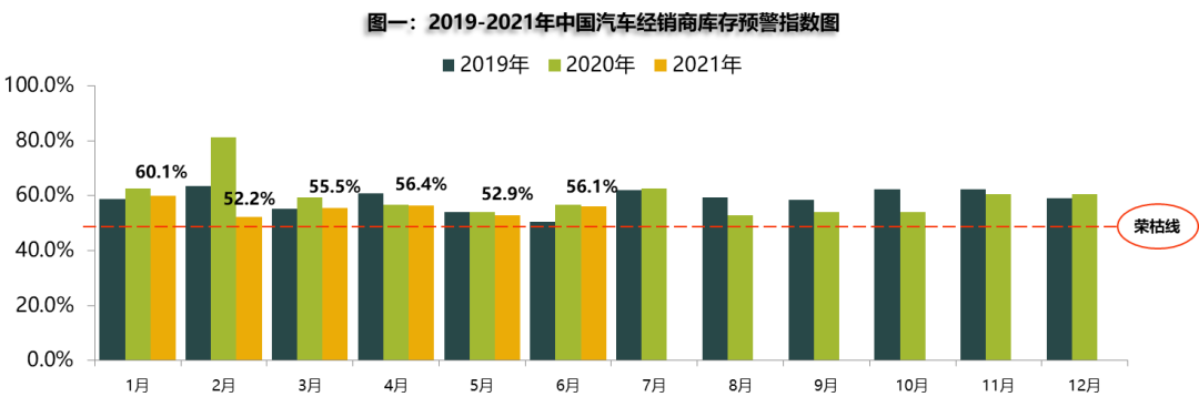 2021年6月30日,中国汽车流通协会发布的最新一期“中国汽车经销商库存预警指数调查”VIA(Vehicle Inventory Alert Index)显示,2021年6月汽车经销商库存预警指数为56.1%,同比下滑0.7个百分点,环比上涨3.2个百分点,库存预警指数位于荣枯线之上。