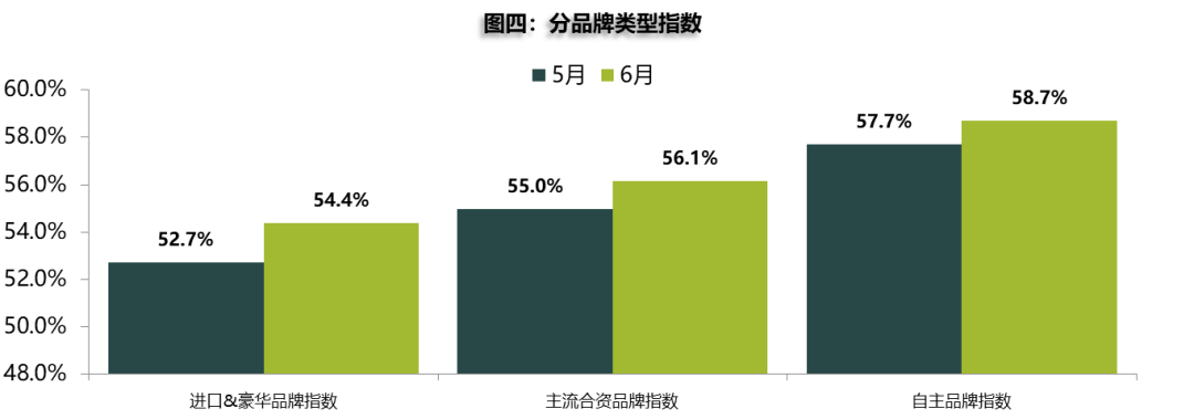 从分品牌类型指数看:从分品牌类型情况看,6月进口&豪华品牌指数、主流合资品牌指数、自主品牌指数环比上升。
