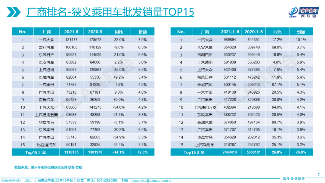 - 狭义乘用车产销情况——2021 年 6 月及累计