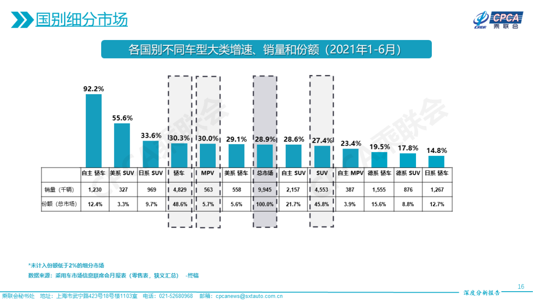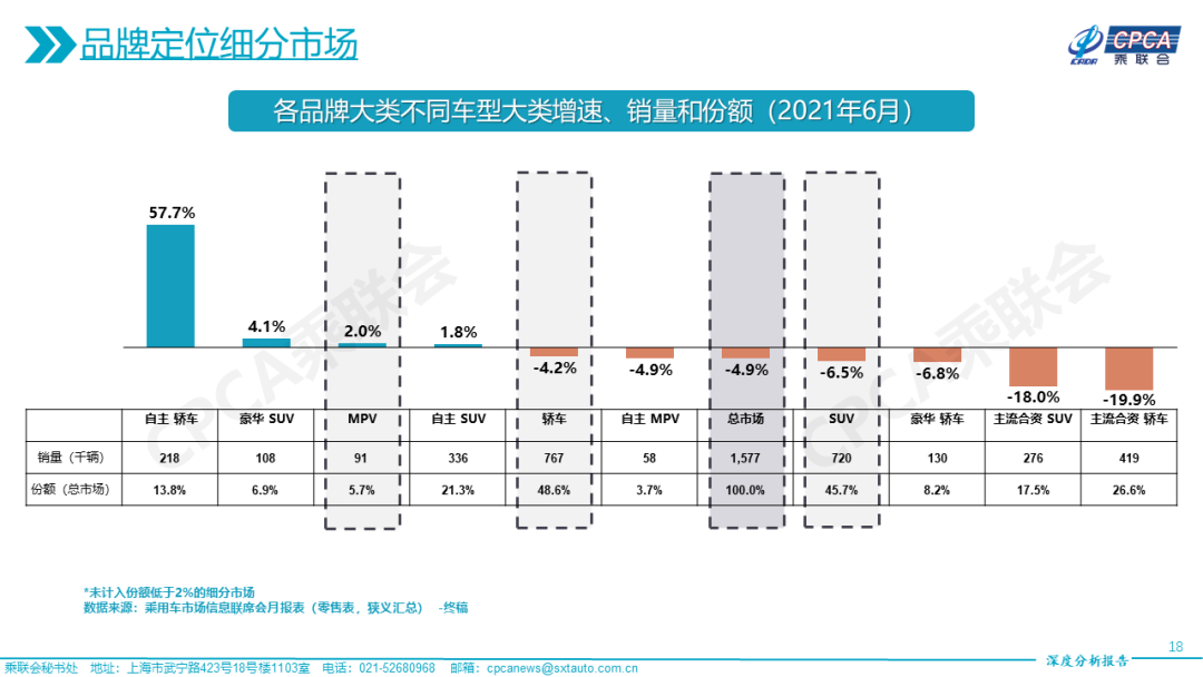 - 各品牌大类下不同车型大类增速、销量和份额——2021 年 6 月及累计