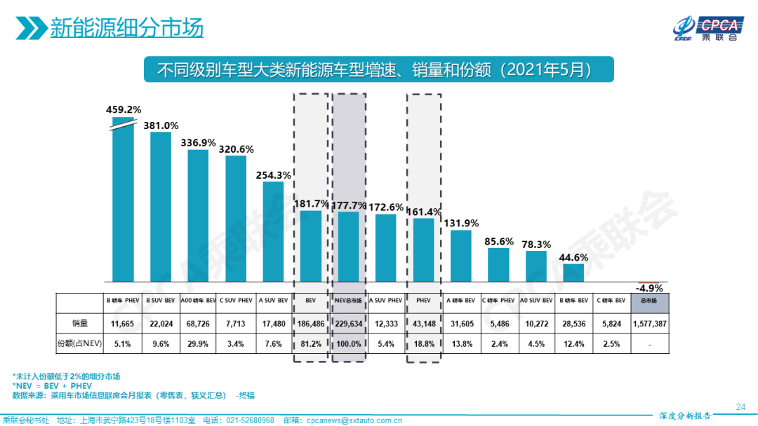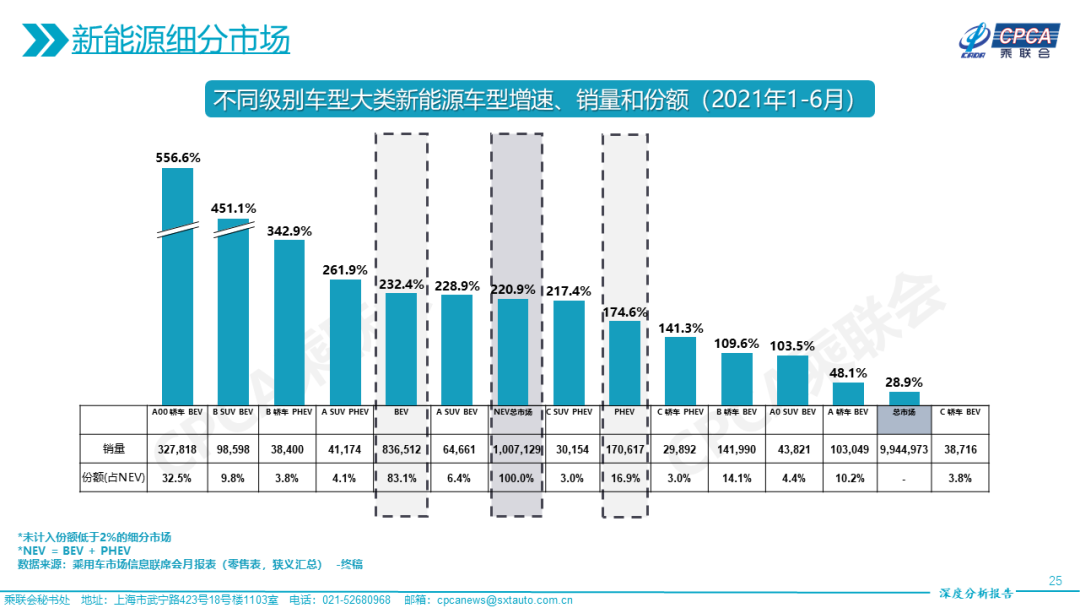- 不同级别车型大类新能源车型增速、销量和份额——2021 年 6 月及累计