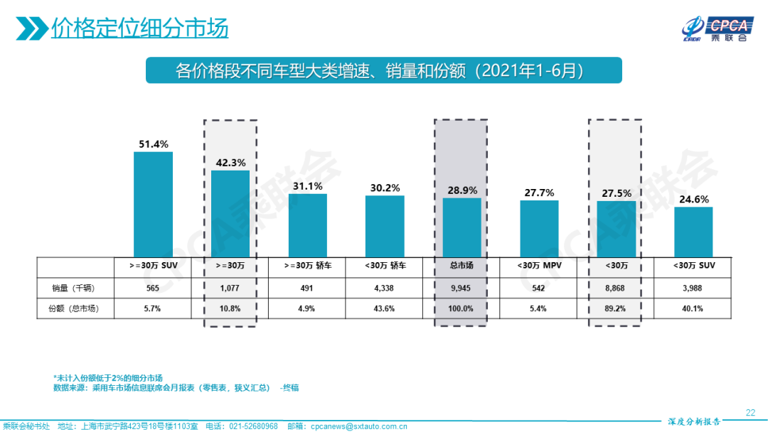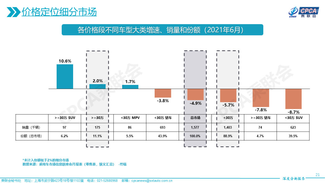 - 各价格段不同车型大类增速、销量和份额——2021 年 6 月及累计