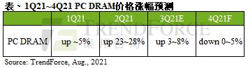 回溯PC DRAM市场今年的变化,今年第二季正值疫情高峰,使得各终端采购采取积极购买策略以避免陷入零部件断链的情形,其中也包含存储器解决方案,而该现象在PC领域反应得相当明显,成为四月PC DRAM价格大涨25%,以及造就购买位元大量成长的关键。