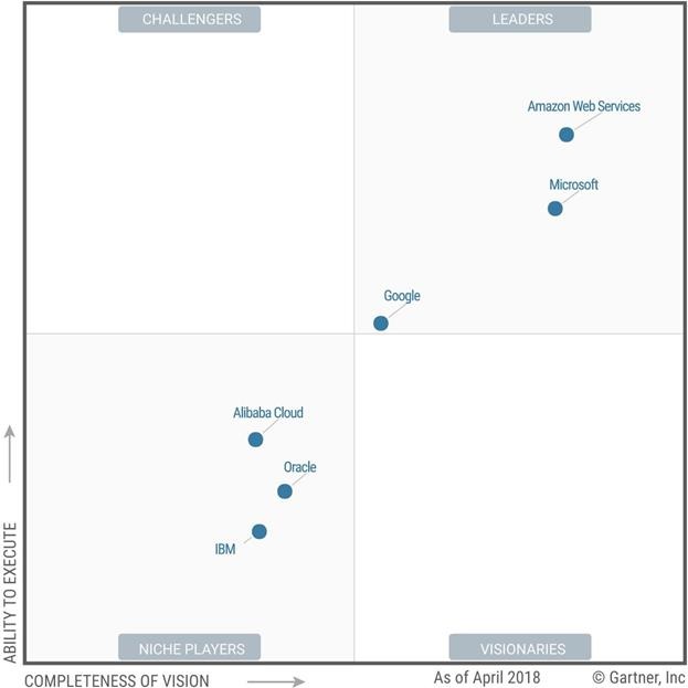 10. 2018 年,亚马逊云科技连续第 8 年排名领导者象限最高、最远的位置。谷歌闯入领导者象限。阿里云跌落至利基者象限。