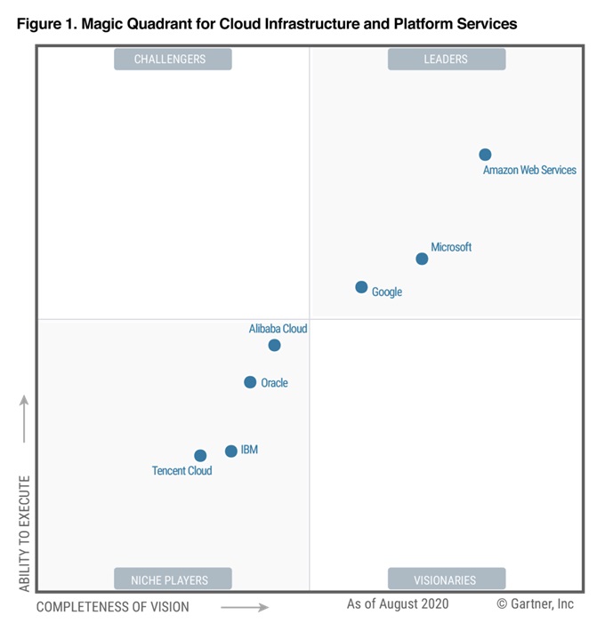 12. 2020 年,亚马逊云科技连续第 10 年排名领导者象限最高、最远的位置。腾讯云首次进入魔力象限的利基象限,排在利基者象限。