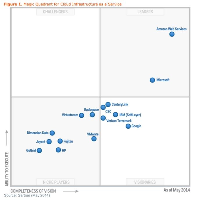 6. 2014 年,亚马逊云科技连续第 4 年排名领导者象限最高、最远的位置。CSC 跌落领导者象限,微软闯入。