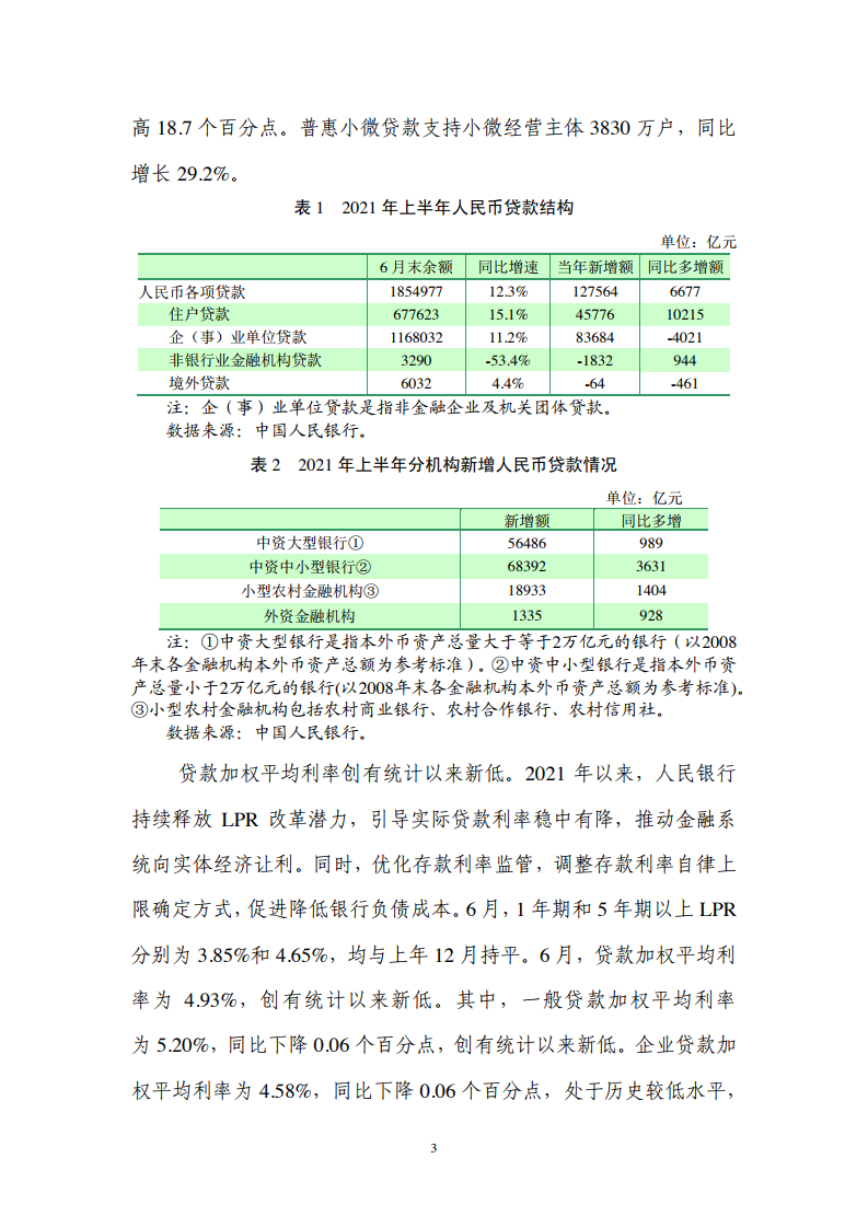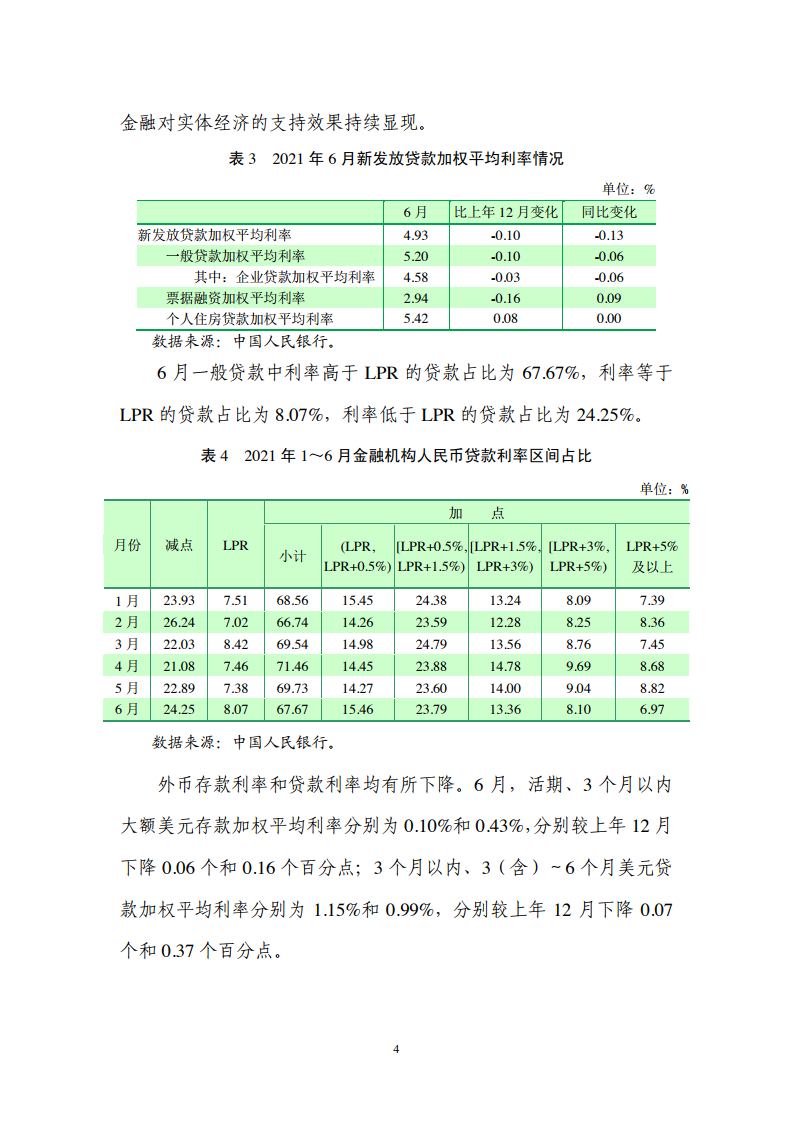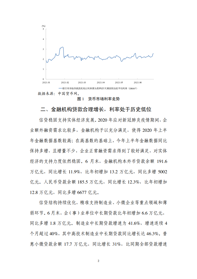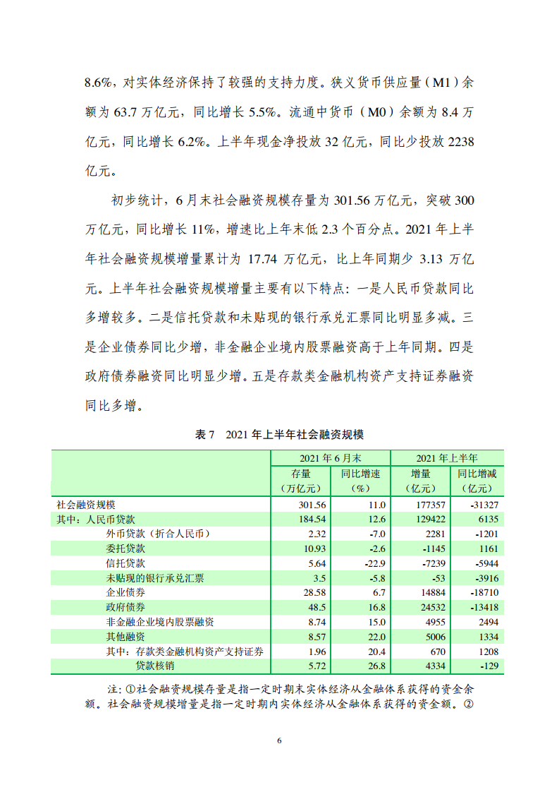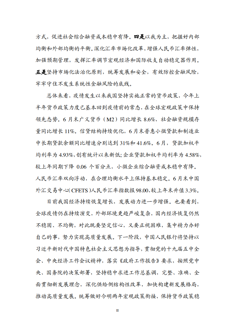 总体来看,疫情发生以来我国坚持实施正常的货币政策,今年上 半年货币政策力度已基本回到疫情前的常态,在全球宏观政策中保持 领先态势。6 月末广义货币(M2)同比增长 8.6%,社会融资规模存 量同比增长 11%。信贷结构持续优化,6 月末普惠小微贷款和制造业 中长期贷款余额同比增速分别达到 31%和 41.6%。6 月,贷款加权平 均利率为 4.93%,创有统计以来新低;企业贷款加权平均利率为 4.58%, 较上年同期下降 0.06 个百分点,小微企业综合融资成本稳中有降。
