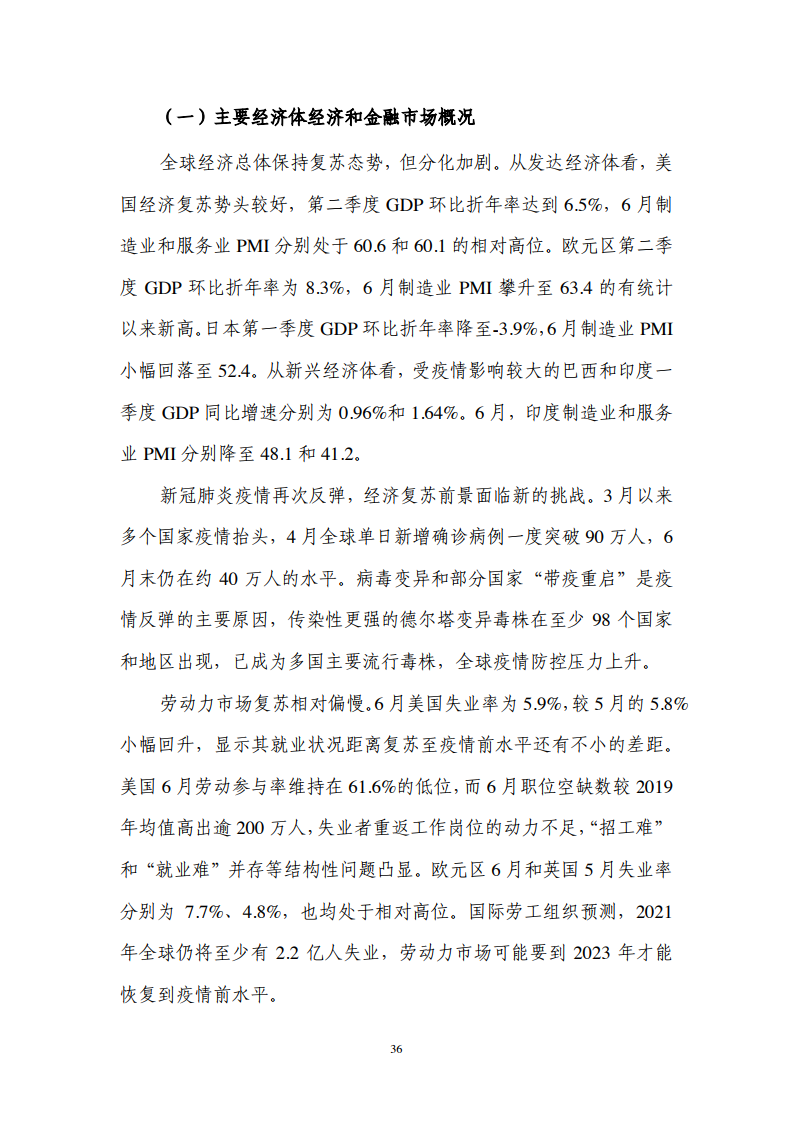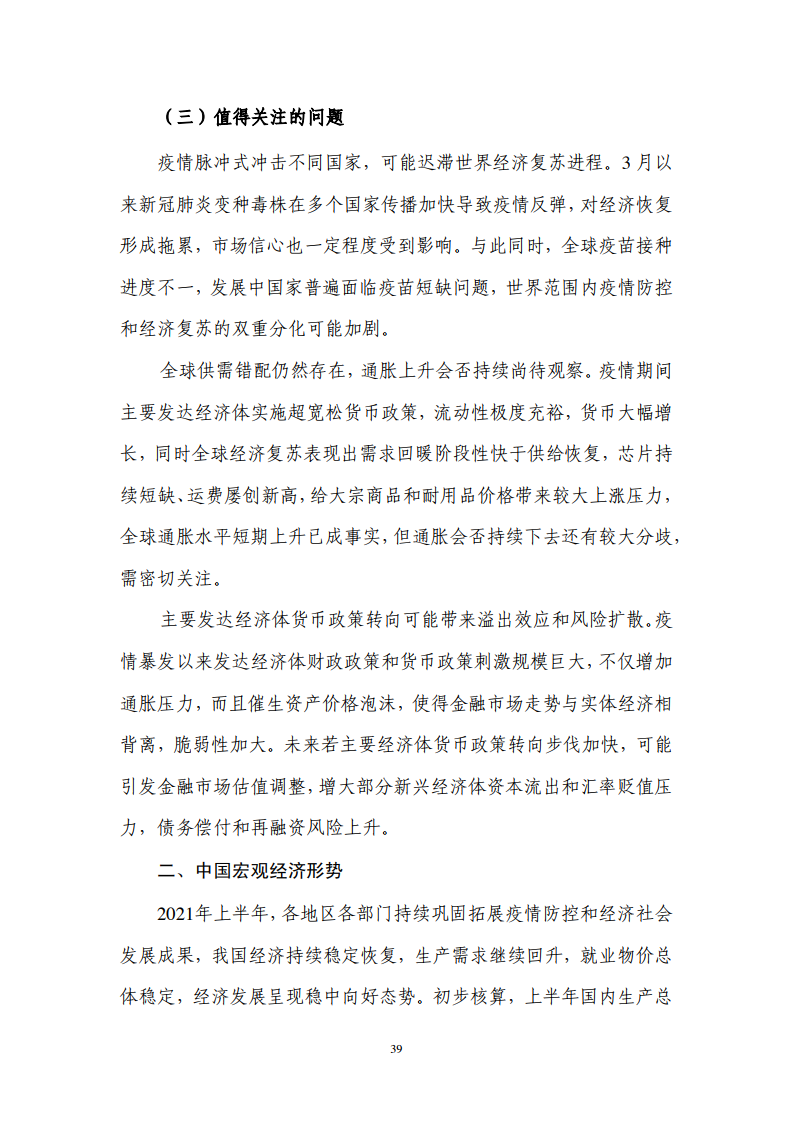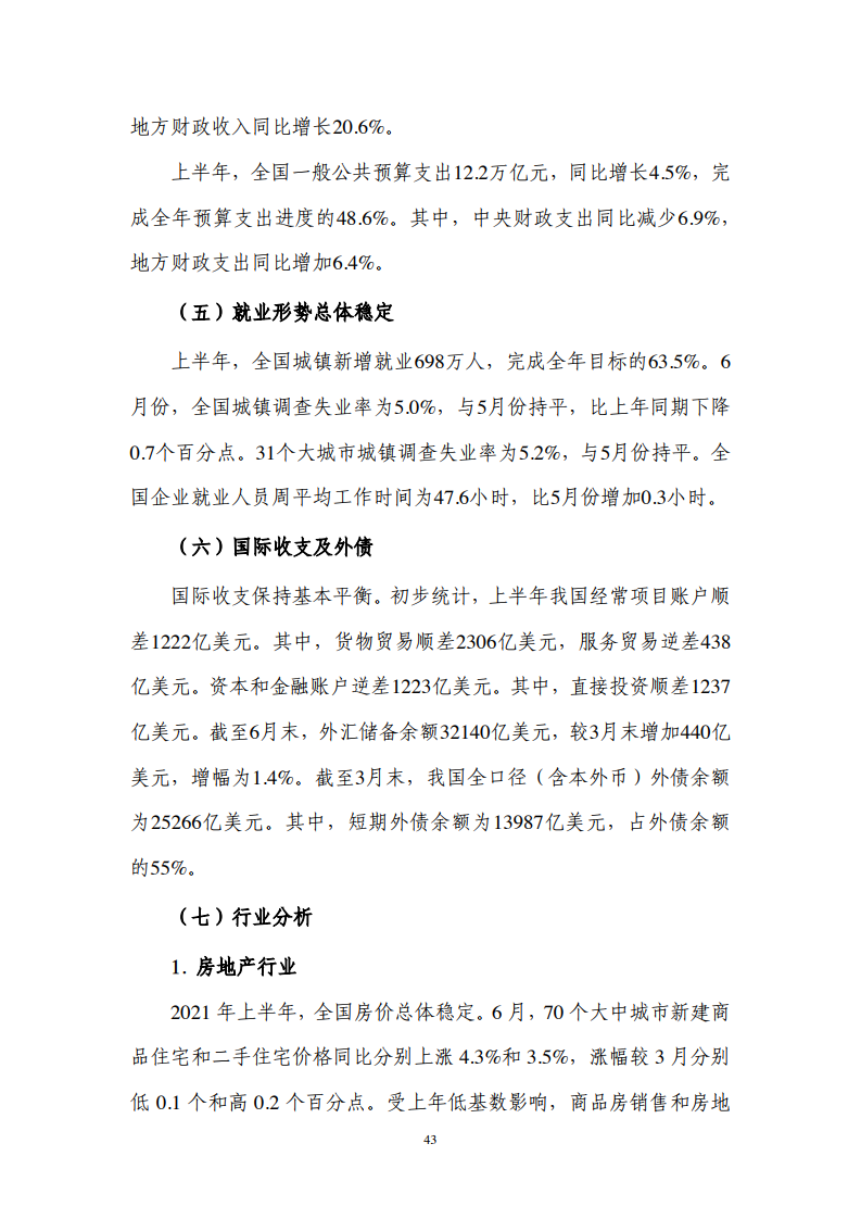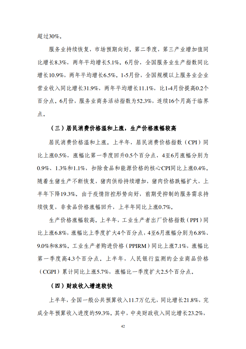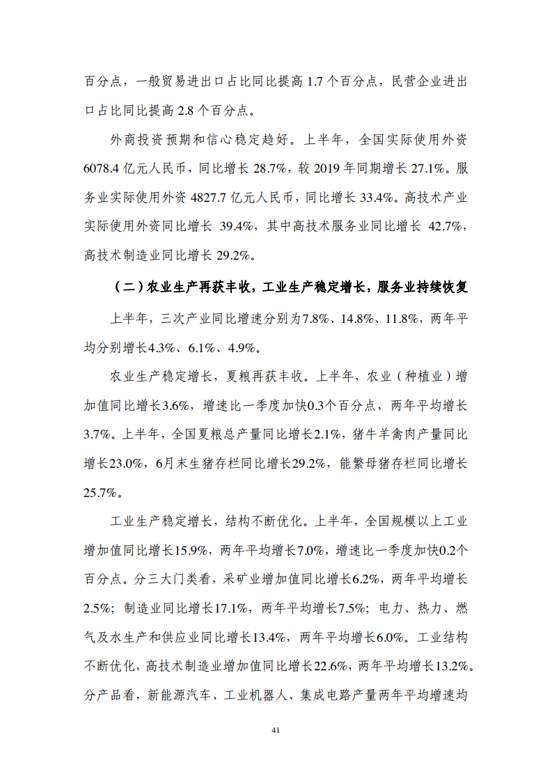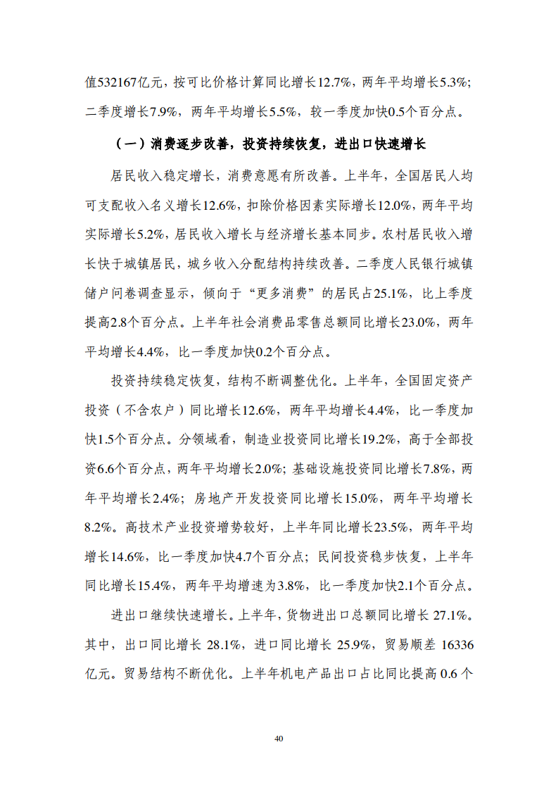 2021 年上半年国内生产总值(GDP)同比增长 12.7%,两年平均 增长 5.3%,其中第二季度同比增长 7.9%,两年平均增长 5.5%,较第 一季度加快 0.5 个百分点;上半年居民消费价格指数(CPI)同比上涨 0.5%,就业形势总体稳定,进出口贸易增势良好。