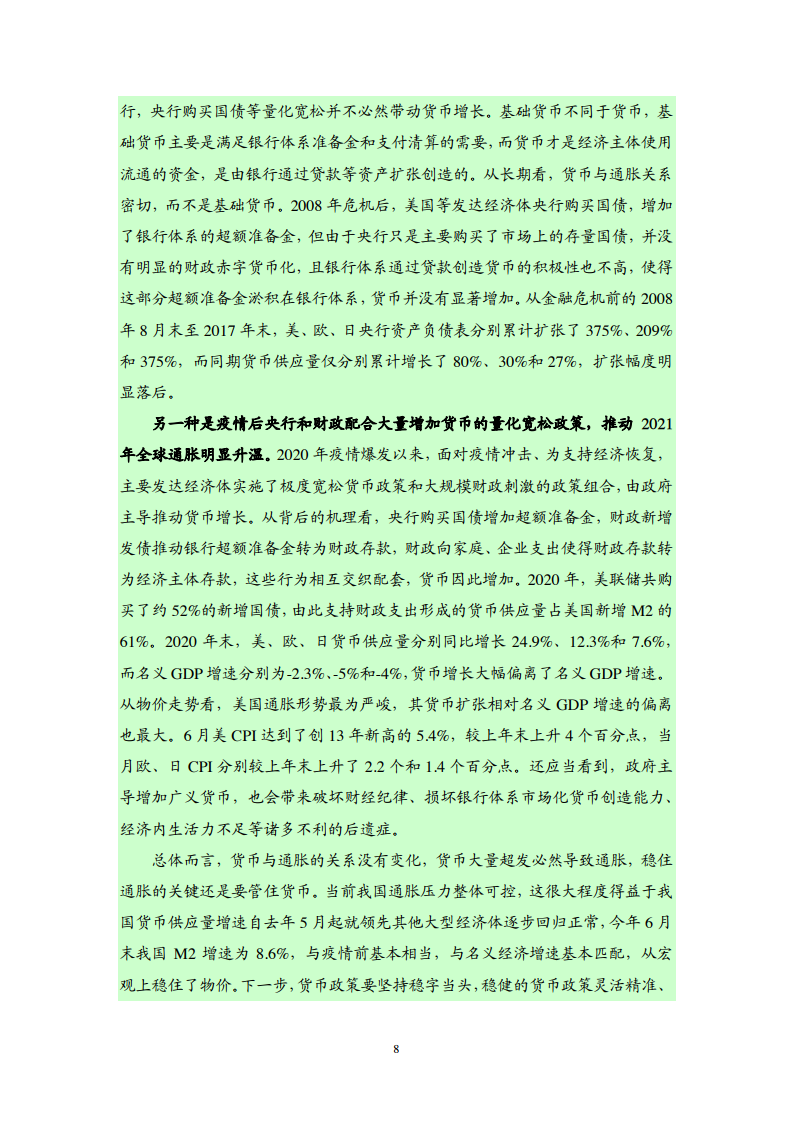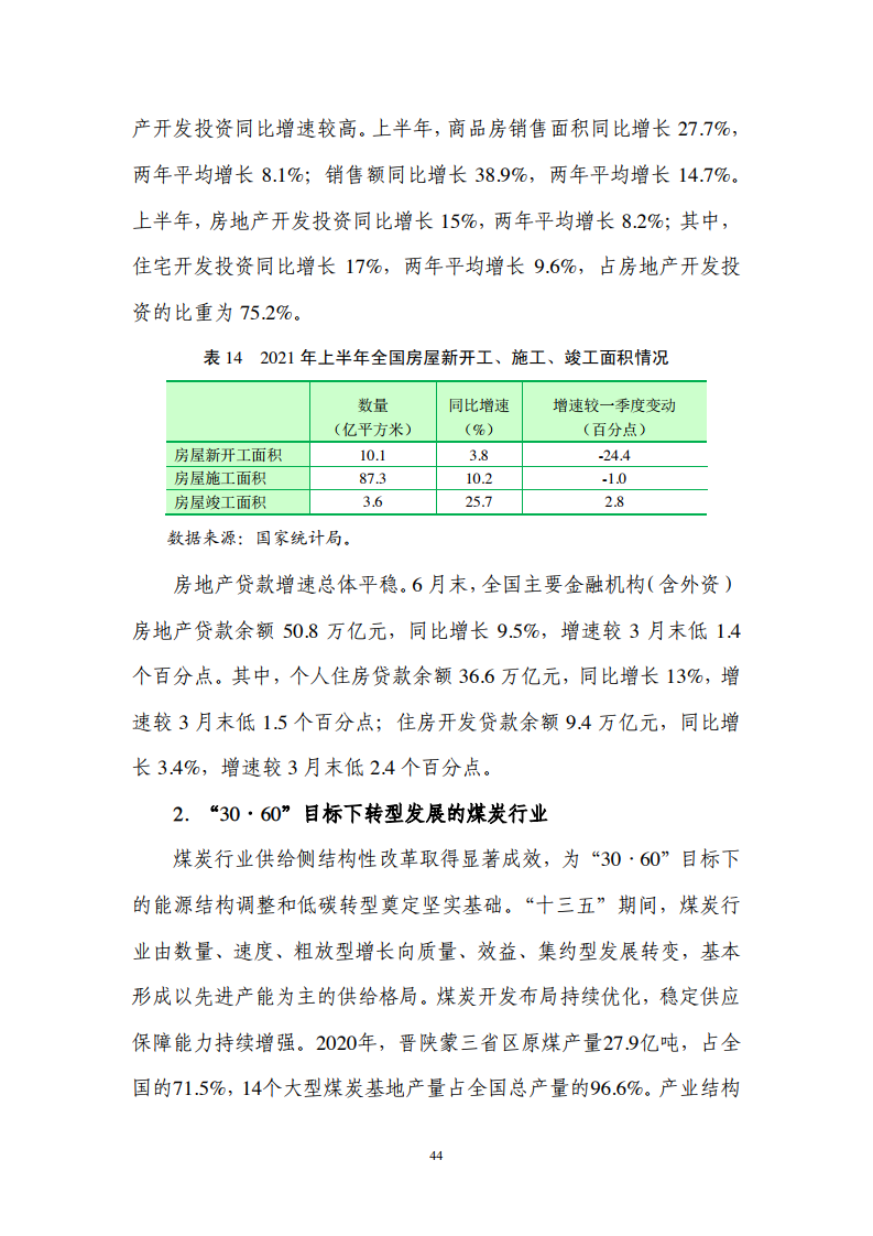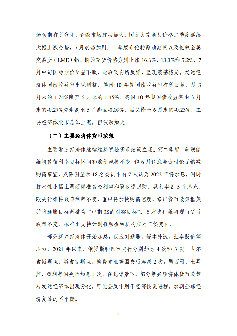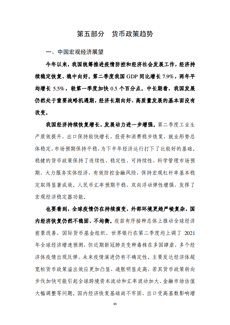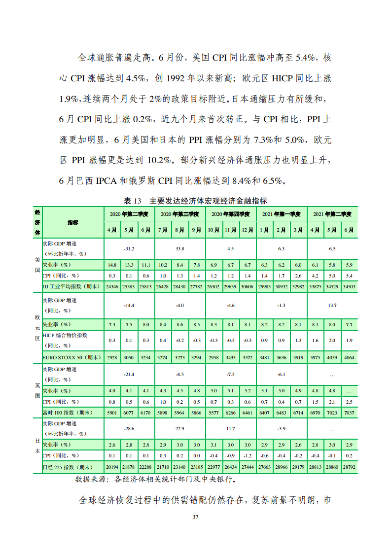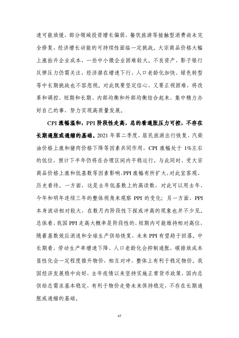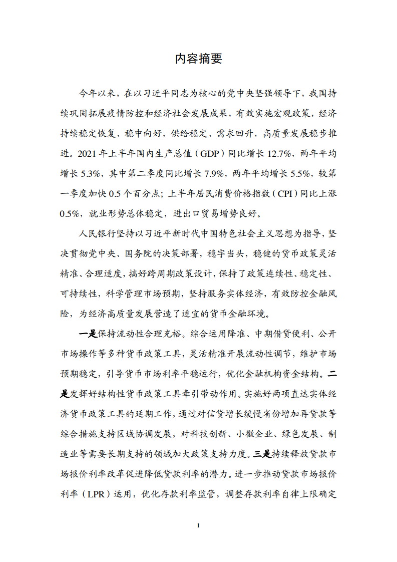2021 年上半年国内生产总值(GDP)同比增长 12.7%,两年平均 增长 5.3%,其中第二季度同比增长 7.9%,两年平均增长 5.5%,较第 一季度加快 0.5 个百分点;上半年居民消费价格指数(CPI)同比上涨 0.5%,就业形势总体稳定,进出口贸易增势良好。